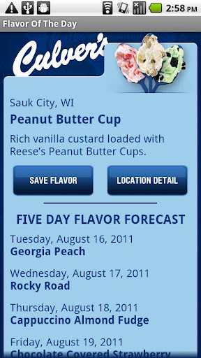 • Flavor of the Day: Never miss your favorite flavor of Culver’s creamy and, oh, so decadent Fresh Frozen Custard. Save your flavor faves, and get push notifications when they are nearby, or available at one of your favorite Culver’s locations. Plus, get a Flavor Forecast so you can plan ahead.