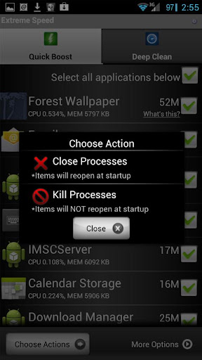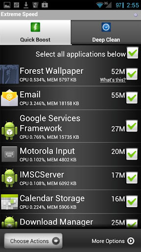 Applications that are running in the background consume battery power and can be slowing down your smart phone's performance. With ExtremeSpeed's simple Quick Boost function, you can close any applications that you are not currently using, and reclaim a significant amount of memory. Recovering this memory can be valuable in improving your smart phone's speed, performance and battery life.