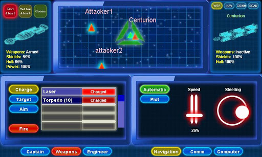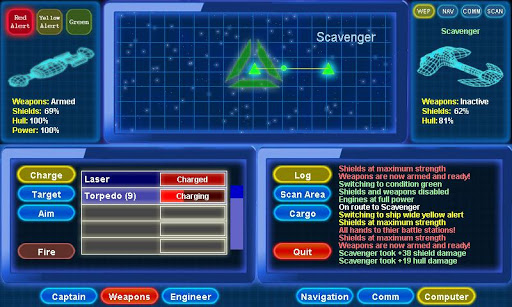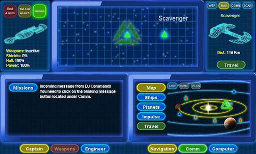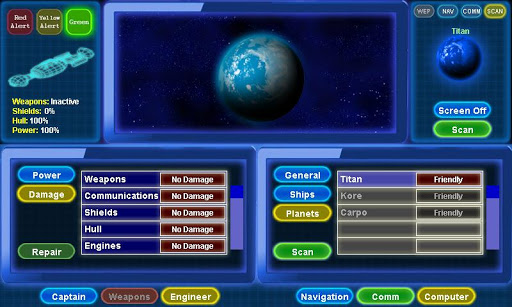 You are the captain of a Earth United Space Vessel. Your mission is to search unregulated space for a ship that has gone missing. As the captain you can make choices on how to go about finding the ship. You can either fight, bribe, barter or interrogate your way around the system. But be careful who you trust. You are given a piloting system that allow you to control, weapons, navigation, engineering, and scanning.