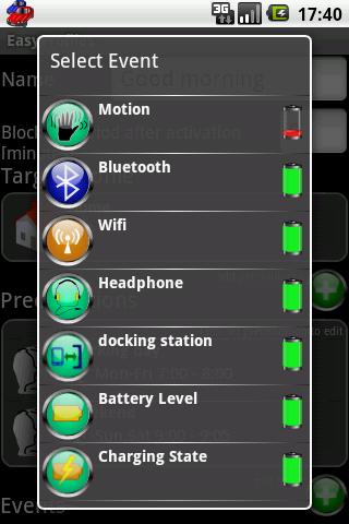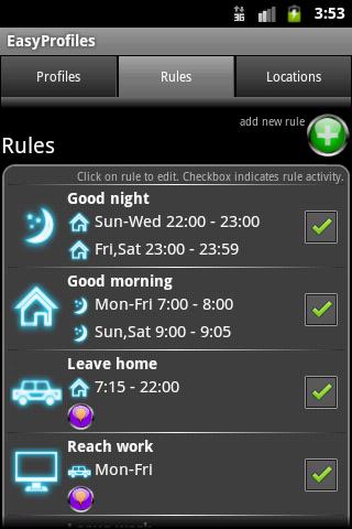 You define rules that activate each profile according to events or other criteria you have defined. The combination of profiles and rules make EasyProfiles a powerful system to enable your Android device to behave as you would like wherever you are.