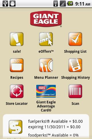 sale! — eOffers™ — My Perks — Shopping List — Recipes — Menu Planner — Shopping History — Store Locator — Giant Eagle Advantage Card® — Scan