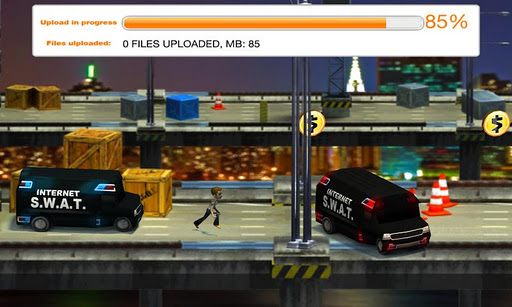 Guide your character across the stage, jumping at the right moment to overcome the different obstacles, as he uploads contents to a website. The character is pursued by law enforcement, the "Internet SWAT" and has different types of barriers, such as police cars, fences with the title "SOPA", police officers, etc. The more megabytes you upload, the harder it is to escape the pursuers and avoid obstacles.This game is an addictive side-scroller in which we make the character jump to avoid obstacles by tapping the screen.
