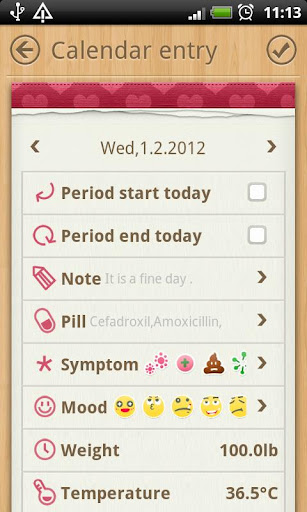 Except the basic period cycle tracker function, with Period Calendar girls can record anything about herself such as cycles, symptoms, moods, intercourse, weight, temperature, note or pills which you want birch control and etc. It is designed to be your personal period tracker diary and sweet secretary.