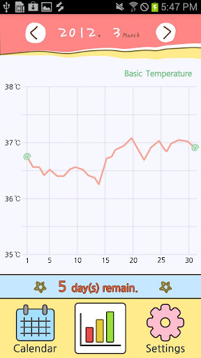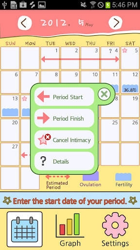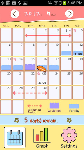 Estimated period schedule and ovulating days (fertility schedule) are automatically calculated for up to 6 months and displayed on the calendar to alarm you and help you plan for vacation, trips, wedding, pregnancy, and birth control.