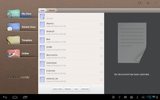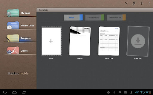 ThinkFree Mobile Pro supports a PC-like experience so that user can not only create new documents with templates but also download more than 40 kinds of extra templates from an online server for free.