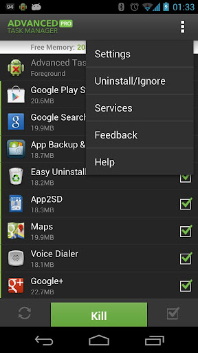 A: You can long click on the task that you want to ignore, then you will get a poped up context menu, click "Ignore". The ignored apps will not be listed in the task list, and will never be killed. You can manage the ignored apps in settings.
