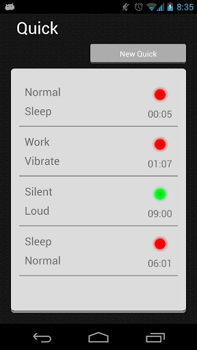Quick will apply a profile for a short pre-determined time and then apply a different profile when that time is up. Useful for those quick meetings the boss surprises you with.