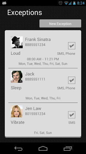 Exceptions are a great way to never miss a phone call or SMS (Text) message. Add a contact to exceptions and when they contact you a profile will apply just moments before so you don’t miss them. "Go SMS Pro" not supported.