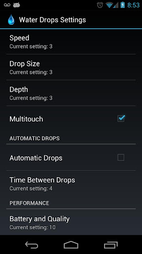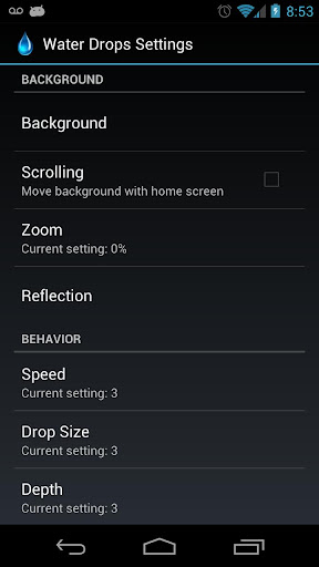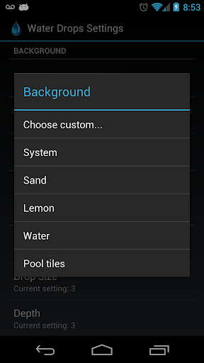 Water Drops simulates water in a pool on any wallpaper. You can use the default pool tile background or customize the wallpaper. You can let the drops fall on it automatically, or tap to create new drops.