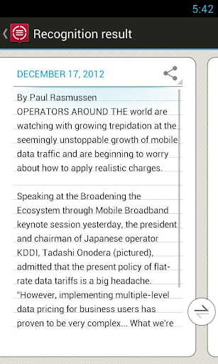 • One-tap transferring of recognition results to other applications - social networks, online storage services, etc. via Android ‘Share’ function